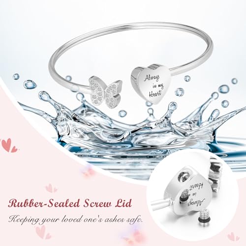 Metal type: Stainless SteelGem type: No gemstoneHEART BUTTERFLY URN BRACELET: This cremation bracelet holds a small portion of ashes or perfume, keeping a treasured memory close to your heart. The delicate heart and butterfly design symbolize love, transformation, and an unbreakable bond, offering comfort and a sense of connection wherever life takes youWATER-RESISTANT and PREMIUM QUALITY: The screw cap features a rubber gasket for a secure, water-resistant seal. Made from 316 stainless steel, this ashes bracelet is smooth, resistant to corrosion, easy to clean, and built to last without rusting, fading, or stainingDETAILS AND PACKAGE: The urn bracelet has an internal diameter of 2.36 inches, with a heart charm measuring 0.55 inches in length and height and a butterfly charm measuring 0.47 inches in length and 0.39 inches in height. It can be gently adjusted for a better fit. The bracelet comes with a set of filling tools, making it easy to securely place ashes insideMEANINGFUL KEEPSAKE: This heart cremation jewelry serves as a heartfelt tribute to a loved one. It is a thoughtful way to honor their memory, making it suitable for memorials, remembrance ceremonies, or as a personal keepsake to cherish foreverCUSTOMER SERVICE: If you have any issues with your purchase, please donβt hesitate to contact us. We are committed to providing a thoughtful solution and ensuring your satisfaction, which is our greatest motivation superb for everyday use. excellent materials and excellent craftsmanship ensure long-lasting durability.